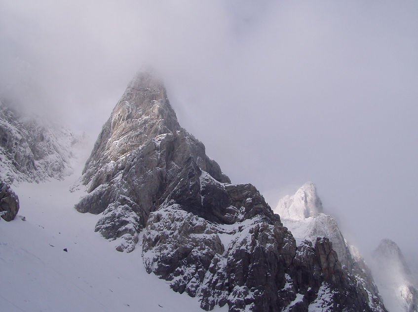 4) Si risale il canale per 20m e prima della sua fine si scalano alla meglio le rocce alla sua destra (IV, chiodi) fino ad un piccolo terrazzino su di una spalla, 50m 2 anelli.